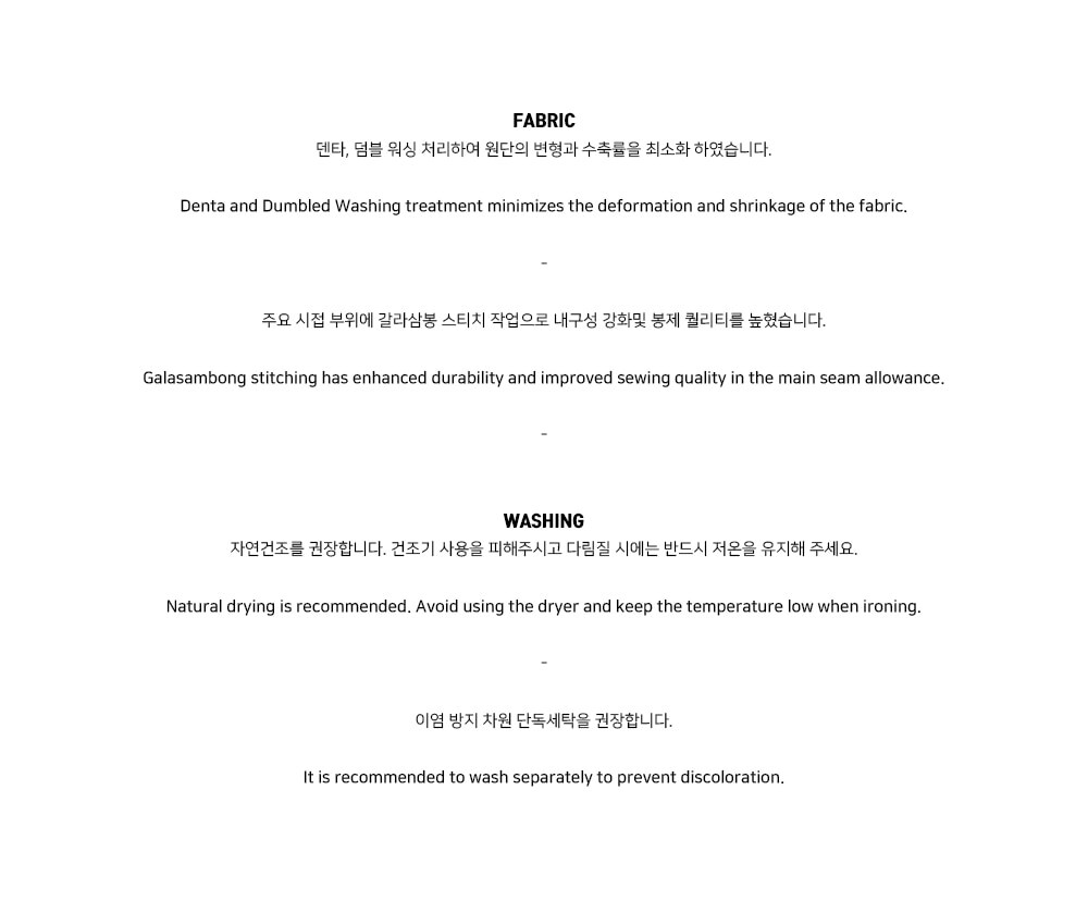 * 덴타, 덤블 워싱 처리하여 원단의 변형과 수축률을 최소화 하였습니다.